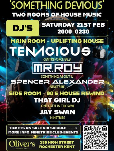Ninetribe takes over Oliver’s Bar & Kitchen for a full-on two room event! We wanted to do something a little different and bring some modern house vibes in, after chatting with our friends Tenacious and Mr. Roy, we bring you 'SOMETHING DEVIOUS' it's gonna go off!